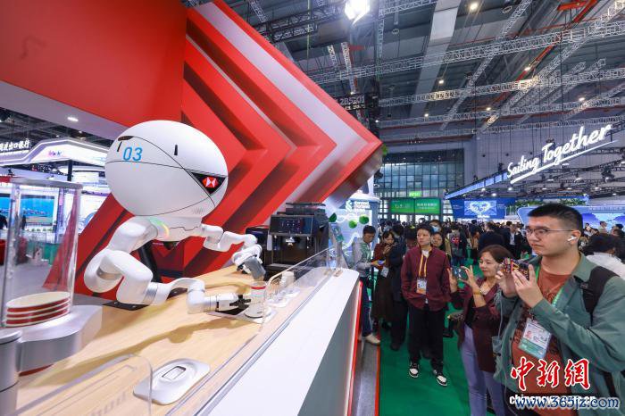 11月8日,在上海举行的第八届进博会功绩生意展区内,机器东谈主制作咖啡。 中新社记者 贾天勇 摄